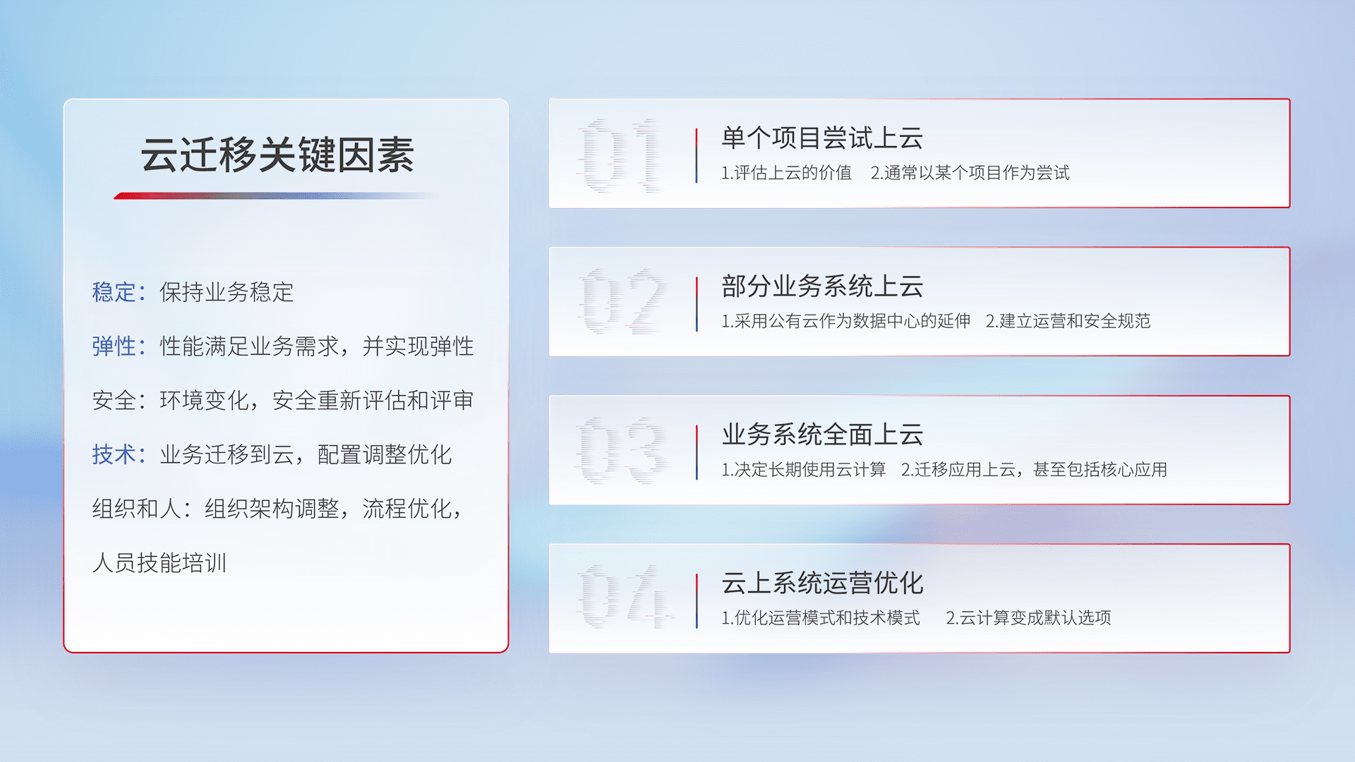 结合实际业务,,,,从规划设计、、云平台选型、、云原生改造、、、、数据迁移、、集成交付,,,,迁移全过程为客户识别最佳上云路径,,,做好风险识别管理,,,设计网络架构、、、、身份权限、、、、安全审计合规、、、、操作审计、、、日志审计、、、、监控告警策略、、、、多站点容灾设计等,,对云上基础设施进行整体规划,,,,提升IT治理水平,,,以满足弹性、、高可用、、、、高性能的需求。。