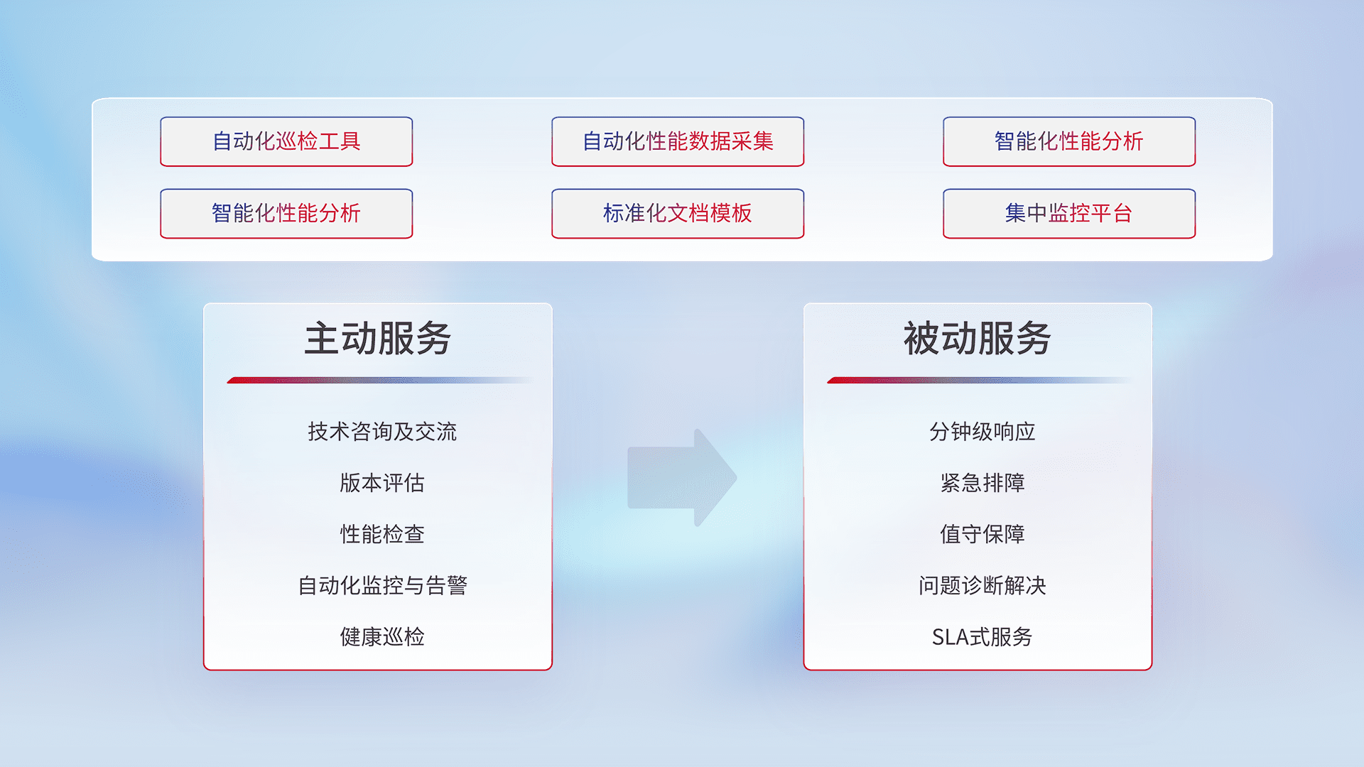 智能化工具和标准化文档,,保障服务质量,,,提供主动服务(包含技术咨询、、版本评估、、、性能检查、、、、自动化监控与告警、、健康巡检)和被动服务包含(分钟级响应、、、紧急排障、、值守保障、、、问题诊断解决、、、SLA服务)。。